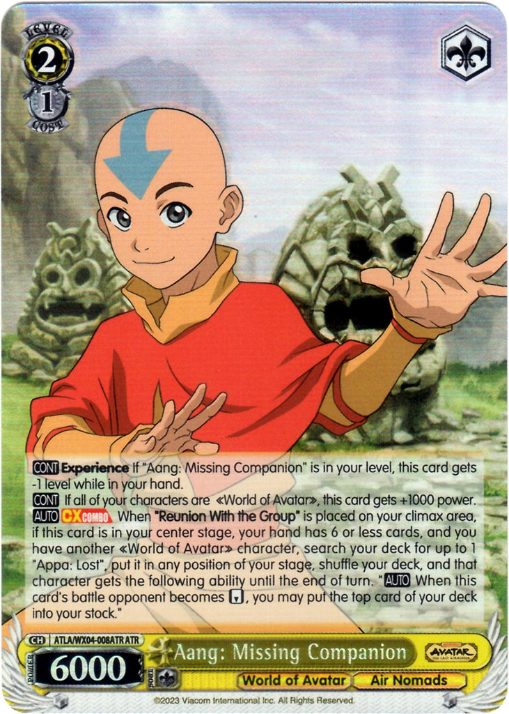【CONT】 Experience If "Aang: Missing Companion" is in your level, this card gets -1 level while in your hand.【CONT】 If all of your characters are 《World of Avatar》, this card gets +1000 power. 【AUTO】 【CXCOMBO】 When "Reunion With the Group" is placed on your climax area, if this card is in your center stage, your hand has 6 or less cards, and you have another 《World of Avatar》 character, search your deck for up to 1 "Appa: Lost", put it in any position of your stage, shuffle your deck, and that character gets the following ability until the end of turn. "【AUTO】 When this card's battle opponent becomes 【REVERSE】, you may put the top card of your deck into your stock."