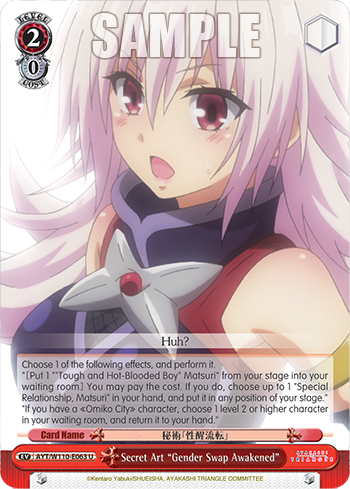 Choose 1 of the following effects, and perform it."[Put 1 ""Tough and Hot-Blooded Boy" Matsuri" from your stage into your waiting room] You may pay the cost. If you do, choose up to 1 "Special Relationship, Matsuri" in your hand, and put it in any position of your stage.""If you have a 《Omiko City》 character, choose 1 level 2 or higher character in your waiting room, and return it to your hand."
