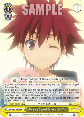If you do not have a 《Omiko City》 character, this card cannot be played from your hand.Look at up to 4 cards from the top of your deck, choose up to 1 《Omiko City》 character from among them, reveal it to your opponent, put it into your hand, and put the rest into your waiting room.You may choose 1 cost 0 or lower character in your opponent's center stage, and return it to their hand.