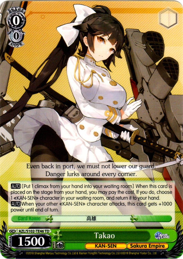 【AUTO】 [Put 1 climax from your hand into your waiting room] When this card is placed on the stage from your hand, you may pay the cost. If you do, choose 1 《KAN-SEN》 character in your waiting room, and return it to your hand.【AUTO】 When your other 《KAN-SEN》 character attacks, this card gets +1000 power until end of turn.