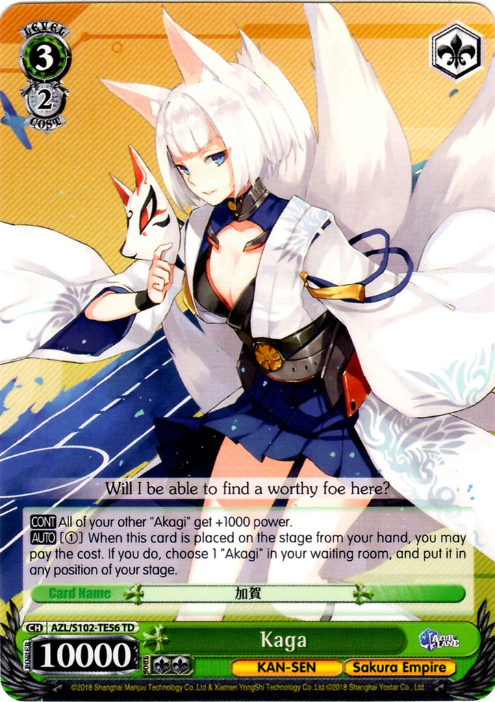 【CONT】 All of your other "Akagi" get +1000 power.【AUTO】 [(1)] When this card is placed on the stage from your hand, you may pay the cost. If you do, choose 1 "Akagi" in your waiting room, and put it in any position of your stage.