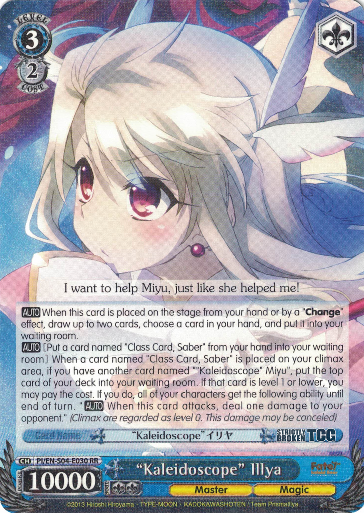 The Fate/Kaleid Liner Prisma Illya English Weiss Schwarz Trading Card Game card images used on this site have been obtained and re-posted from Bushiroad websites in accordance to the guidelines stated there. Re-use of these images (re-post, distribution) is strictly prohibited.
