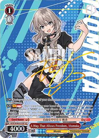 【CONT】 During your turn, if all of your characters are 《Music》, this card gets +2000 power.【AUTO】 【CXCOMBO】 [Put 1 card from your hand into your waiting room] When this card attacks, if "VOID" is in your climax area, and you have another 《Music》 character, you may pay the cost. If you do, choose up to 2 《Music》 characters in your waiting room, and return them to your hand.