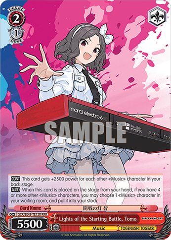 【CONT】 This card gets +2500 power for each other 《Music》 character in your back stage.【AUTO】 When this card is placed on the stage from your hand, if you have 4 or more other 《Music》 characters, you may choose 1 《Music》 character in your waiting room, and put it into your stock.