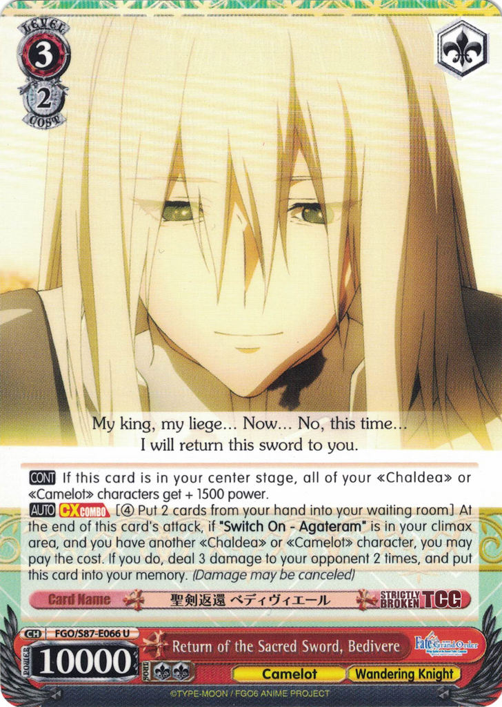 【AUTO】 【CXCOMBO】 [(4) Put 2 cards from your hand into your waiting room] At the end of this card's attack, if "Switch On - Agateram" is in your climax area, and you have another 《Chaldea》 or 《Camelot》 character, you may pay the cost. If you do, deal 3 damage to your opponent 2 times, and put this card into your memory. (Damage may be canceled)