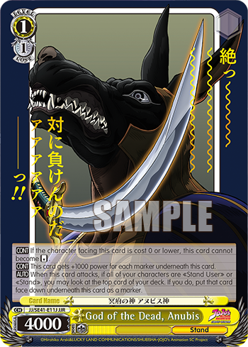 【AUTO】 When this card attacks, if all of your characters are 《Stand User》 or 《Stand》, you may look at the top card of your deck. If you do, put that card face down underneath this card as a marker.