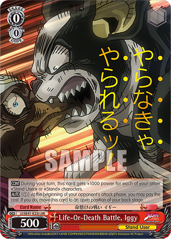 【CONT】 During your turn, this card gets +1000 power for each of your other 《Stand User》 or 《Stand》 characters.