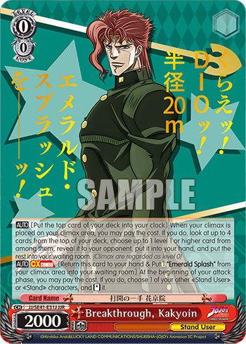 【AUTO】 【CXCOMBO】 [Return this card to your hand & Put 1 "Emerald Splash" from your climax area into your waiting room] At the beginning of your attack phase, you may pay the cost. If you do, choose 1 of your other 《Stand User》 or 《Stand》 characters, and 【STAND】 it.