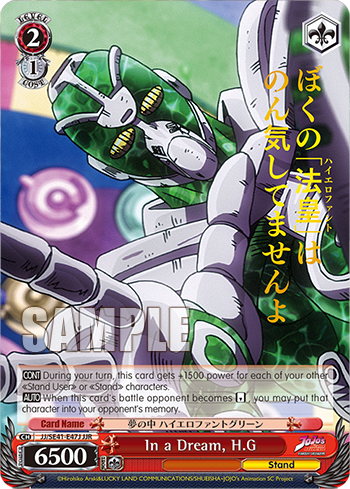 【CONT】 During your turn, this card gets +1500 power for each of your other 《Stand User》 or 《Stand》 characters. 【AUTO】 When this card's battle opponent becomes 【REVERSE】, you may put that character into your opponent's memory.