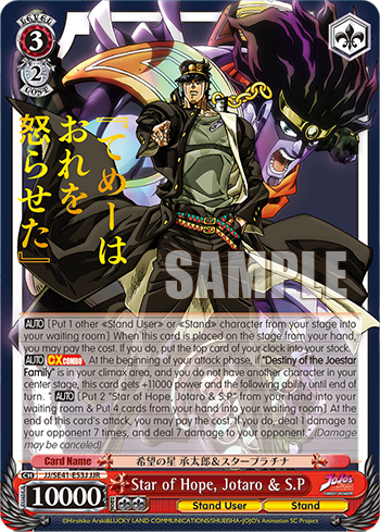 【AUTO】 【CXCOMBO】 At the beginning of your attack phase, if "Destiny of the Joestar Family" is in your climax area, and you do not have another character in your center stage, this card gets +11000 power and the following ability until end of turn. "【AUTO】 [Put 2 "Star of Hope, Jotaro & S.P" from your hand into your waiting room & Put 4 cards from your hand into your waiting room] At the end of this card's attack, you may pay the cost. If you do, deal 1 damage to your opponent 7 times, and deal 7 damage to your opponent." (Damage may be canceled)