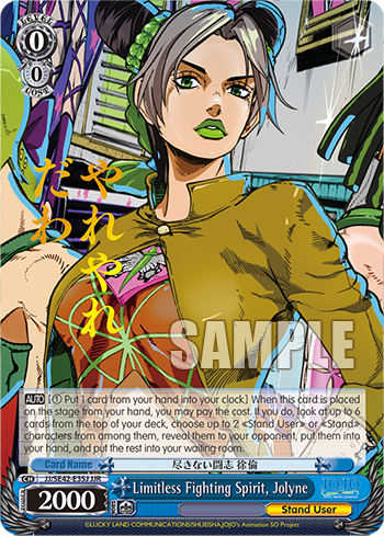 【AUTO】 [(1) Put 1 card from your hand into your clock] When this card is placed on the stage from your hand, you may pay the cost. If you do, look at up to 6 cards from the top of your deck, choose up to 2 《Stand User》 or 《Stand》 characters from among them, reveal them to your opponent, put them into your hand, and put the rest into your waiting room.