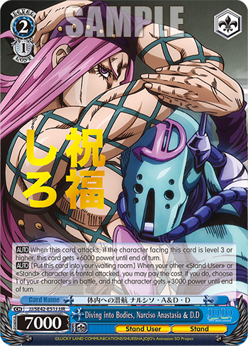 【AUTO】 [Put this card into your waiting room] When your other 《Stand User》 or 《Stand》 character is frontal attacked, you may pay the cost. If you do, choose 1 of your characters in battle, and that character gets +3000 power until end of turn.
