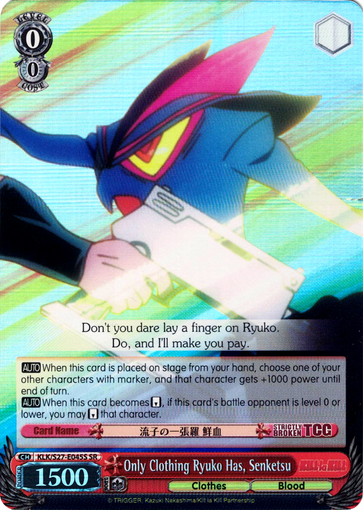 The Kill la Kill Foils English Weiss Schwarz Trading Card Game card images used on this site have been obtained and re-posted from Bushiroad websites in accordance to the guidelines stated there. Re-use of these images (re-post, distribution) is strictly prohibited.