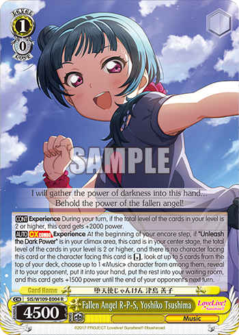 【AUTO】 【CXCOMBO】 Experience At the beginning of your encore step, if "Unleash the Dark Power" is in your climax area, this card is in your center stage, the total level of the cards in your level is 2 or higher, and there is no character facing this card or the character facing this card is 【REVERSE】, look at up to 5 cards from the top of your deck, choose up to 1 《Music》 character from among them, reveal it to your opponent, put it into your hand, put the rest into your waiting room, and this card gets +1500 power until the end of your opponent's next turn.