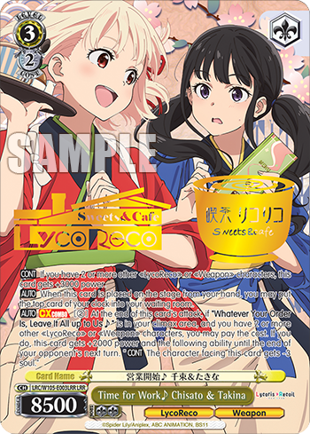 【AUTO】 【CXCOMBO】 [(2)] At the end of this card's attack, if "Whatever Your Order Is, Leave It All up to Us ♪" is in your climax area, and you have 2 or more other 《LycoReco》 or 《Weapon》 characters, you may pay the cost. If you do, this card gets +2000 power and the following ability until the end of your opponent's next turn. "【CONT】 The character facing this card gets -3 soul."