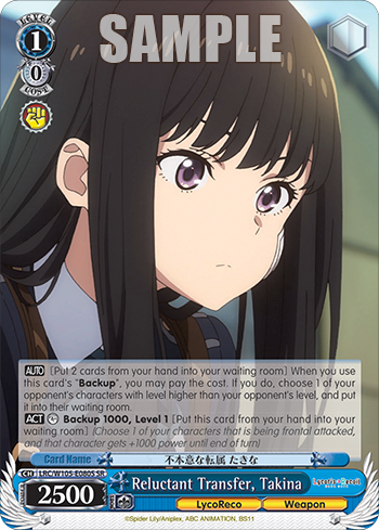 【AUTO】 [Put 2 cards from your hand into your waiting room] When you use this card's "Backup", you may pay the cost. If you do, choose 1 of your opponent's characters with level higher than your opponent's level, and put it into their waiting room.