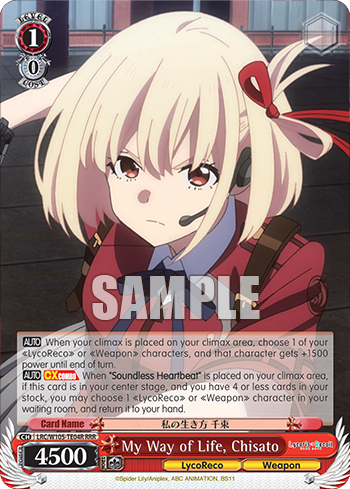 【AUTO】 When your climax is placed on your climax area, choose 1 of your 《LycoReco》 or 《Weapon》 characters, and that character gets +1500 power until end of turn.【AUTO】 【CXCOMBO】 When "Soundless Heartbeat" is placed on your climax area, if this card is in your center stage, and you have 4 or less cards in your stock, you may choose 1 《LycoReco》 or 《Weapon》 character in your waiting room, and return it to your hand.
