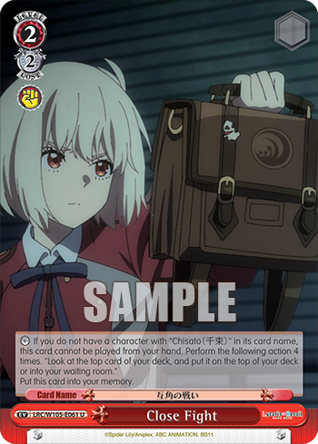 【COUNTER】 If you do not have a character with "Chisato(千束)" in its card name, this card cannot be played from your hand. Perform the following action 4 times. "Look at the top card of your deck, and put it on the top of your deck or into your waiting room."