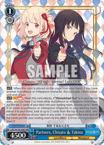 【AUTO】 【CXCOMBO】 When this card attacks, if "Mismatched Duo" is in your climax area, and you have 2 or more other 《LycoReco》 or 《Weapon》 characters, put the top 2 cards of your deck into your waiting room, choose up to 1 level X or lower《LycoReco》 or 《Weapon》 character in your waiting room, return it to your hand, look at up to 2 cards from the top of your deck, and put them on the top of your deck in any order. X is equal to the total level of the cards put into your waiting room by this effect. (Climax are regarded as level 0)