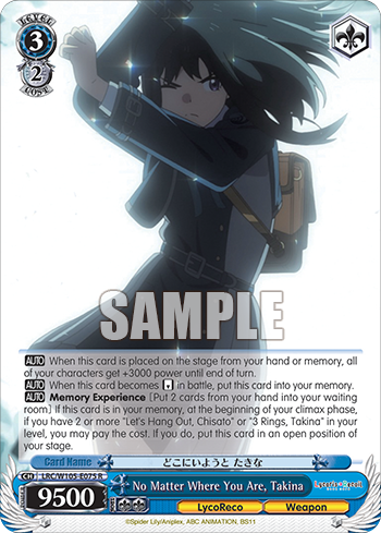 【AUTO】 Memory Experience [Put 2 cards from your hand into your waiting room] If this card is in your memory, at the beginning of your climax phase, if you have 2 or more "Let's Hang Out, Chisato" or "3 Rings, Takina" in your level, you may pay the cost. If you do, put this card in an open position of your stage.