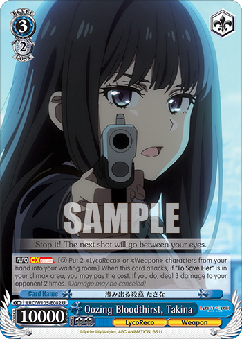 【AUTO】 【CXCOMBO】 [(3) Put 2 《LycoReco》 or 《Weapon》 characters from your hand into your waiting room] When this card attacks, if "To Save Her" is in your climax area, you may pay the cost. If you do, deal 3 damage to your opponent 2 times. (Damage may be canceled)