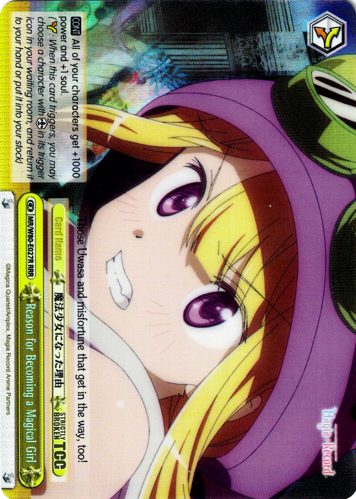 The TV Anime "Magia Record: Puella Magi Madoka Magica Side Story" English Weiss Schwarz Trading Card Game card images used on this site have been obtained and re-posted from Bushiroad websites in accordance to the guidelines stated there. Re-use of these images (re-post, distribution) is strictly prohibited.