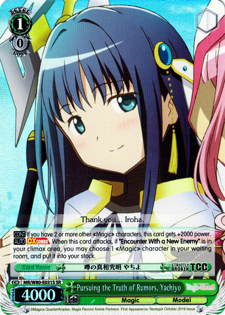 The TV Anime "Magia Record: Puella Magi Madoka Magica Side Story" English Weiss Schwarz Trading Card Game card images used on this site have been obtained and re-posted from Bushiroad websites in accordance to the guidelines stated there. Re-use of these images (re-post, distribution) is strictly prohibited.