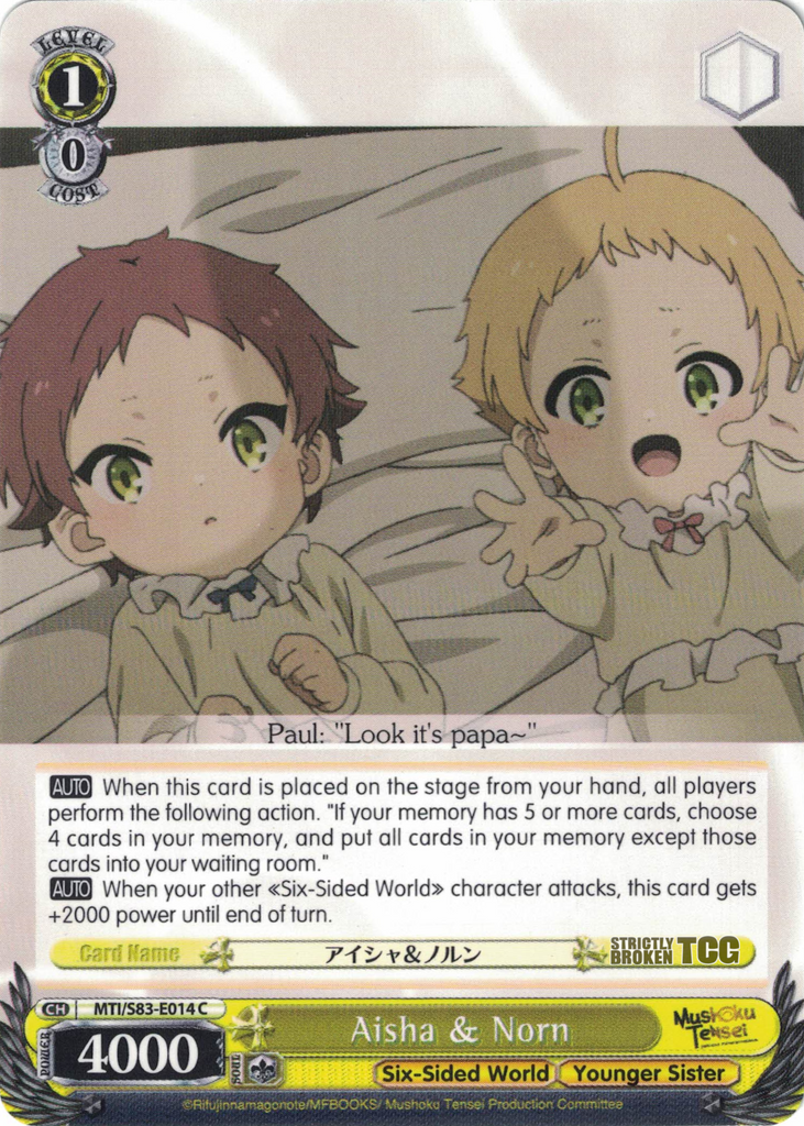 The Mushoku Tensei English Weiss Schwarz Trading Card Game card images used on this site have been obtained and re-posted from Bushiroad websites in accordance to the guidelines stated there. Re-use of these images (re-post, distribution) is strictly prohibited.