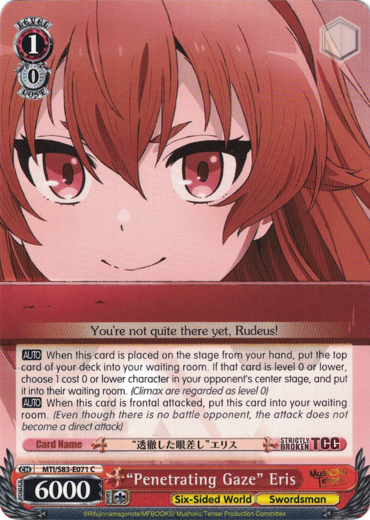 The Mushoku Tensei English Weiss Schwarz Trading Card Game card images used on this site have been obtained and re-posted from Bushiroad websites in accordance to the guidelines stated there. Re-use of these images (re-post, distribution) is strictly prohibited.