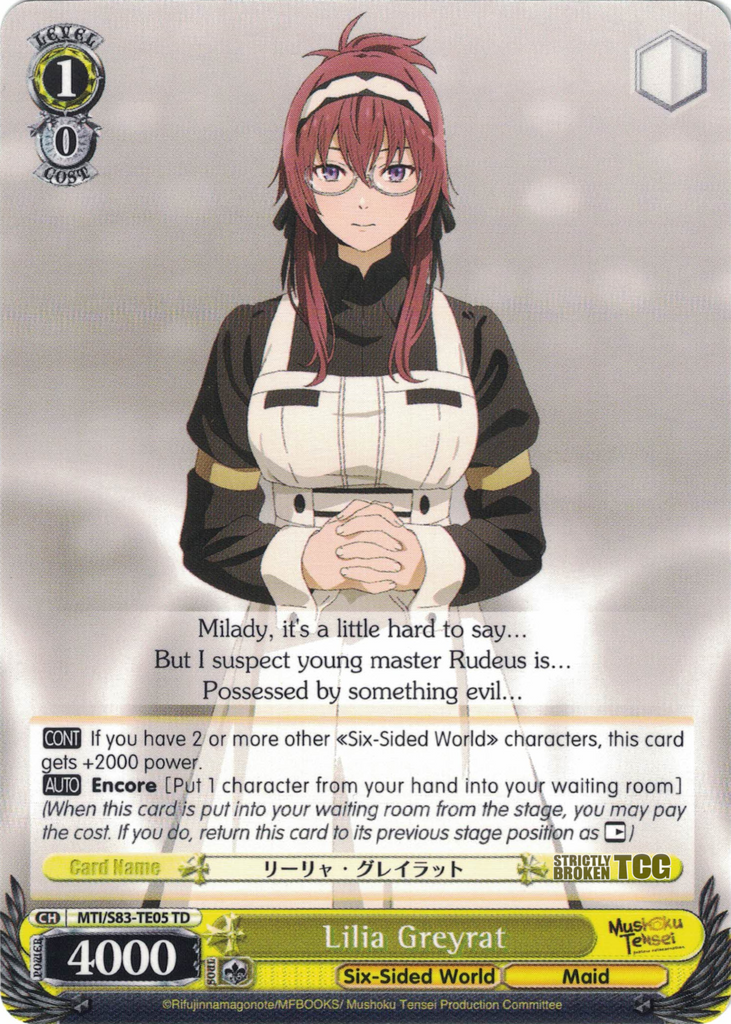 The Mushoku Tensei Trial Deck English Weiss Schwarz Trading Card Game card images used on this site have been obtained and re-posted from Bushiroad websites in accordance to the guidelines stated there. Re-use of these images (re-post, distribution) is strictly prohibited.