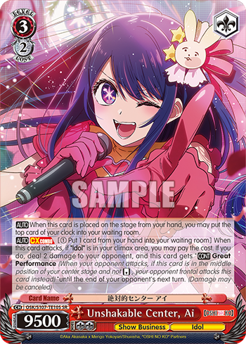【AUTO】 【CXCOMBO】 [(1) Put 1 card from your hand into your waiting room] When this card attacks, if "Idol" is in your climax area, you may pay the cost. If you do, deal 2 damage to your opponent, and this card gets "【CONT】 Great Performance (When your opponent attacks, if this card is in the middle position of your center stage and not 【REVERSE】, your opponent frontal attacks this card instead)"until the end of your opponent's next turn. (Damage may be canceled)