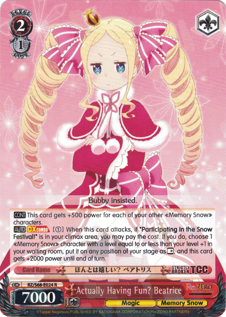 The Re:ZERO -Starting Life in Another World- Memory Snow English Weiss Schwarz Trading Card Game card images used on this site have been obtained and re-posted from Bushiroad websites in accordance to the guidelines stated there. Re-use of these images (re-post, distribution) is strictly prohibited. |