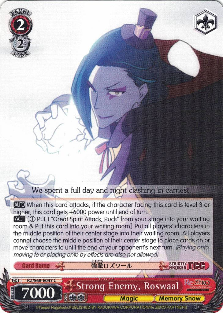 The Re:ZERO -Starting Life in Another World- Memory Snow English Weiss Schwarz Trading Card Game card images used on this site have been obtained and re-posted from Bushiroad websites in accordance to the guidelines stated there. Re-use of these images (re-post, distribution) is strictly prohibited.