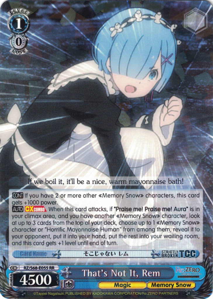 The Re:ZERO -Starting Life in Another World- Memory Snow English Weiss Schwarz Trading Card Game card images used on this site have been obtained and re-posted from Bushiroad websites in accordance to the guidelines stated there. Re-use of these images (re-post, distribution) is strictly prohibited.