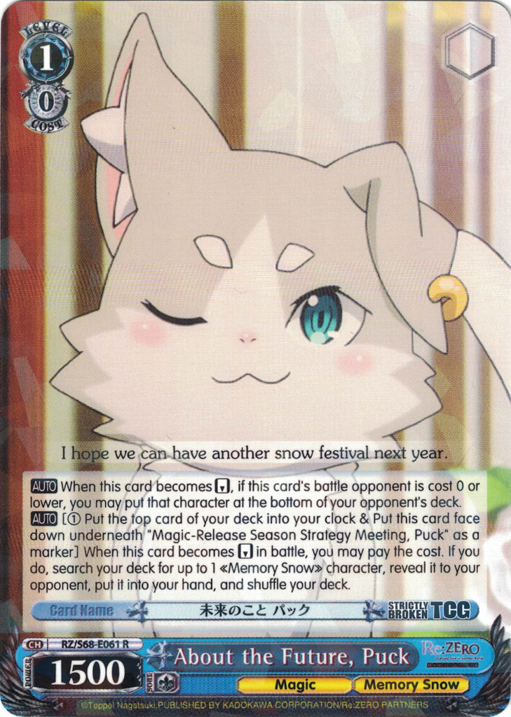 The Re:ZERO -Starting Life in Another World- Memory Snow English Weiss Schwarz Trading Card Game card images used on this site have been obtained and re-posted from Bushiroad websites in accordance to the guidelines stated there. Re-use of these images (re-post, distribution) is strictly prohibited.
