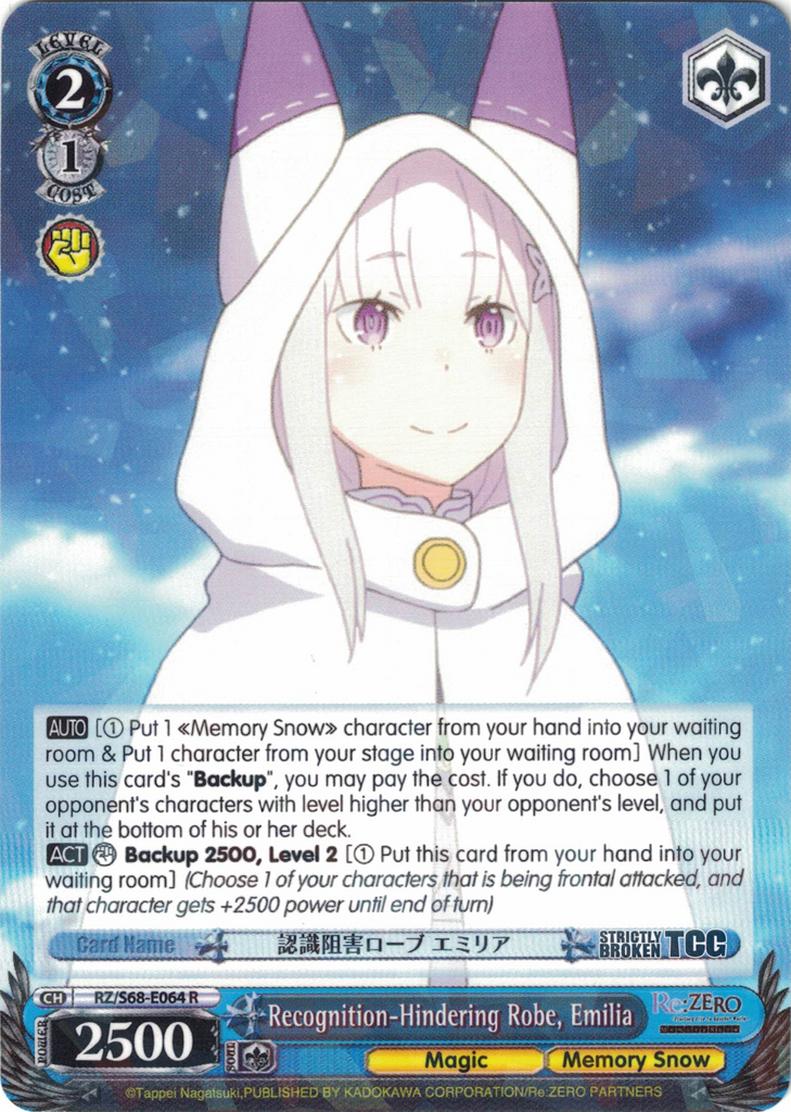 The Re:ZERO -Starting Life in Another World- Memory Snow English Weiss Schwarz Trading Card Game card images used on this site have been obtained and re-posted from Bushiroad websites in accordance to the guidelines stated there. Re-use of these images (re-post, distribution) is strictly prohibited.