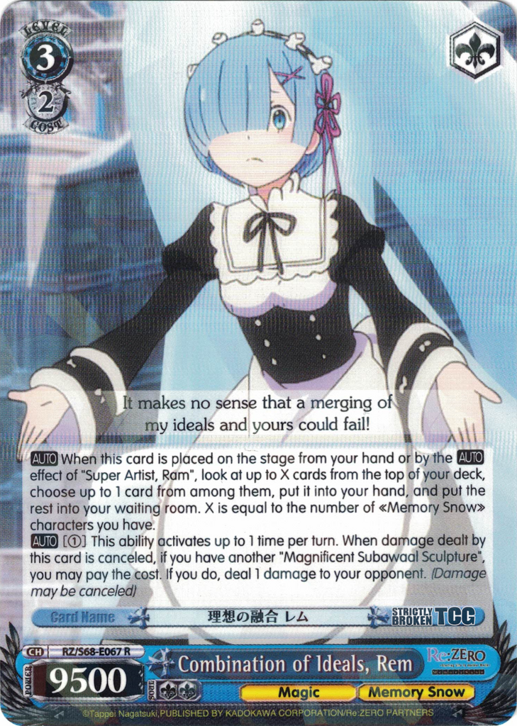 The Re:ZERO -Starting Life in Another World- Memory Snow English Weiss Schwarz Trading Card Game card images used on this site have been obtained and re-posted from Bushiroad websites in accordance to the guidelines stated there. Re-use of these images (re-post, distribution) is strictly prohibited.