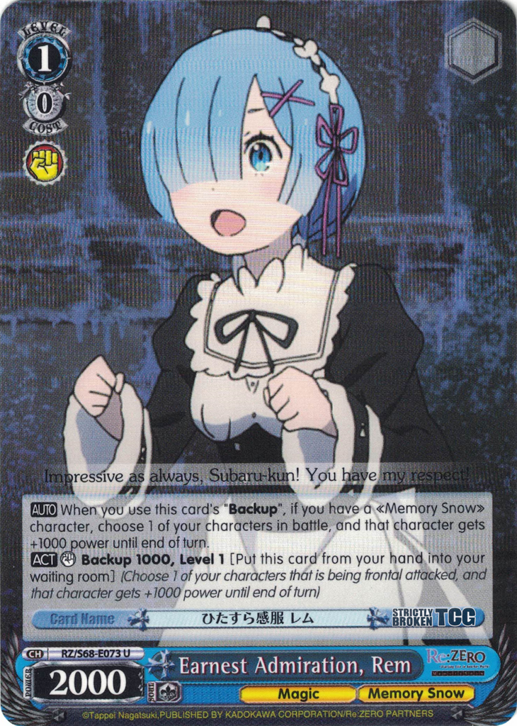 The Re:ZERO -Starting Life in Another World- Memory Snow English Weiss Schwarz Trading Card Game card images used on this site have been obtained and re-posted from Bushiroad websites in accordance to the guidelines stated there. Re-use of these images (re-post, distribution) is strictly prohibited.