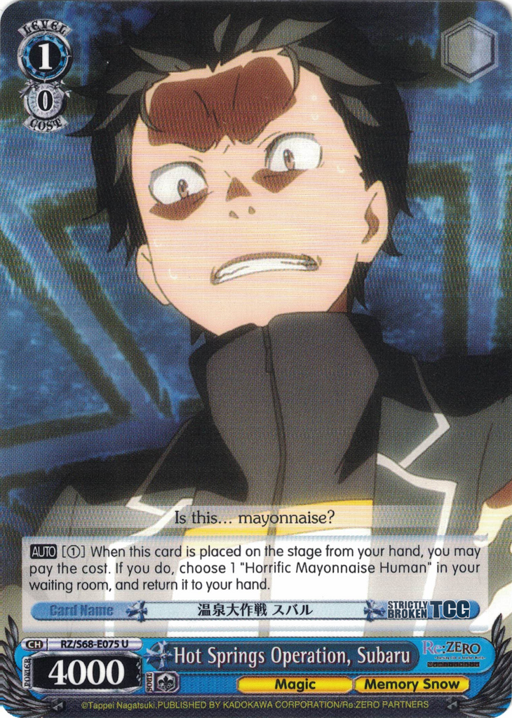 The Re:ZERO -Starting Life in Another World- Memory Snow English Weiss Schwarz Trading Card Game card images used on this site have been obtained and re-posted from Bushiroad websites in accordance to the guidelines stated there. Re-use of these images (re-post, distribution) is strictly prohibited.