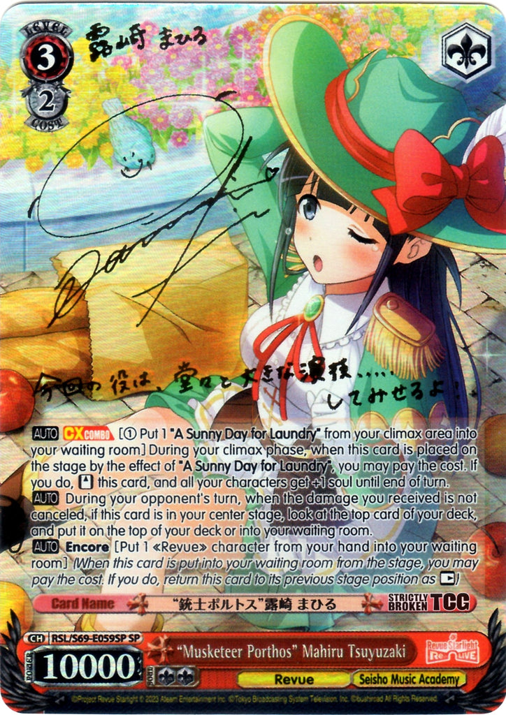 【AUTO】 【CXCOMBO】 [(1) Put 1 "A Sunny Day for Laundry" from your climax area into your waiting room] During your climax phase, when this card is placed on the stage by the effect of "A Sunny Day for Laundry", you may pay the cost. If you do, 【STAND】 this card, and all your characters get +1 soul until end of turn.【AUTO】 During your opponent's turn, when the damage you received is not canceled, if this card is in your center stage, look at the top card of your deck, and put it on the top of your deck or into your waiting room.【AUTO】 Encore [Put 1 《Revue》 character from your hand into your waiting room] (When this card is put into your waiting room from the stage, you may pay the cost. If you do, return this card to its previous stage position as 【REST】)