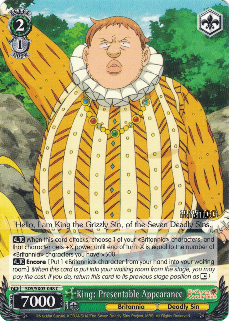 The Seven Deadly Sins English Weiss Schwarz Trading Card Game card images used on this site have been obtained and re-posted from Bushiroad websites in accordance to the guidelines stated there. Re-use of these images (re-post, distribution) is strictly prohibited.