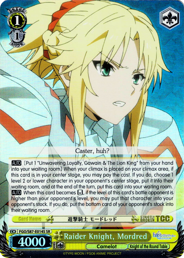 【AUTO】 [Put 1 "Unwavering Loyalty, Gawain & The Lion King" from your hand into your waiting room] When your climax is placed on your climax area, if this card is in your center stage, you may pay the cost. If you do, choose 1 level 2 or lower character in your opponent's center stage, put it into their waiting room, and at the end of the turn, put this card into your waiting room.