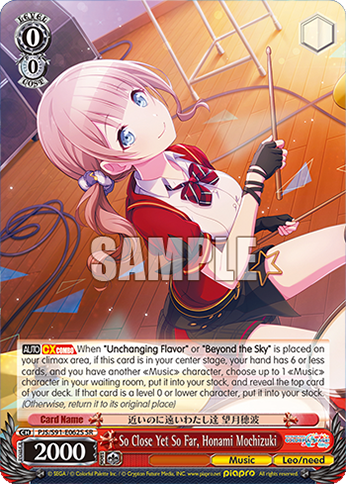 【AUTO】 【CXCOMBO】 When "Unchanging Flavor" or "Beyond the Sky" is placed on your climax area, if this card is in your center stage, your hand has 6 or less cards, and you have another 《Music》 character, choose up to 1 《Music》 character in your waiting room, put it into your stock, and reveal the top card of your deck. If that card is a level 0 or lower character, put it into your stock. (Otherwise, return it to its original place)