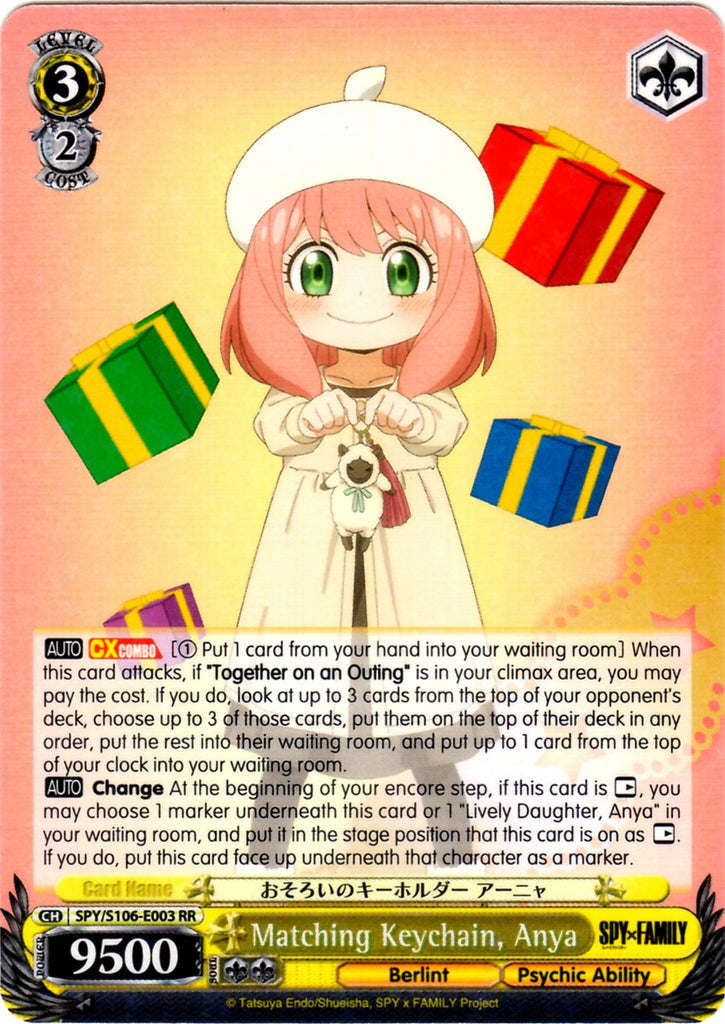 【AUTO】 【CXCOMBO】 [(1) Put 1 card from your hand into your waiting room] When this card attacks, if "Together on an Outing" is in your climax area, you may pay the cost. If you do, look at up to 3 cards from the top of your opponent's deck, choose up to 3 of those cards, put them on the top of their deck in any order, put the rest into their waiting room, and put up to 1 card from the top of your clock into your waiting room.【AUTO】 Change At the beginning of your encore step, if this card is 【REST】, you may choose 1 marker underneath this card or 1 "Lively Daughter, Anya" in your waiting room, and put it in the stage position that this card is on as 【REST】. If you do, put this card face up underneath that character as a marker.