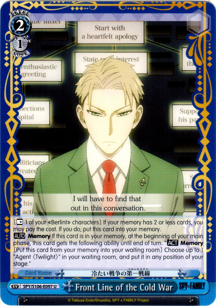 [【REST】 1 of your 《Berlint》 characters] If your memory has 2 or less cards, you may pay the cost. If you do, put this card into your memory.【AUTO】 Memory If this card is in your memory, at the beginning of your main phase, this card gets the following ability until end of turn. "【ACT】 Memory [Put this card from your memory into your waiting room] Choose up to 1 "Agent 〈Twilight〉" in your waiting room, and put it in any position of your stage."